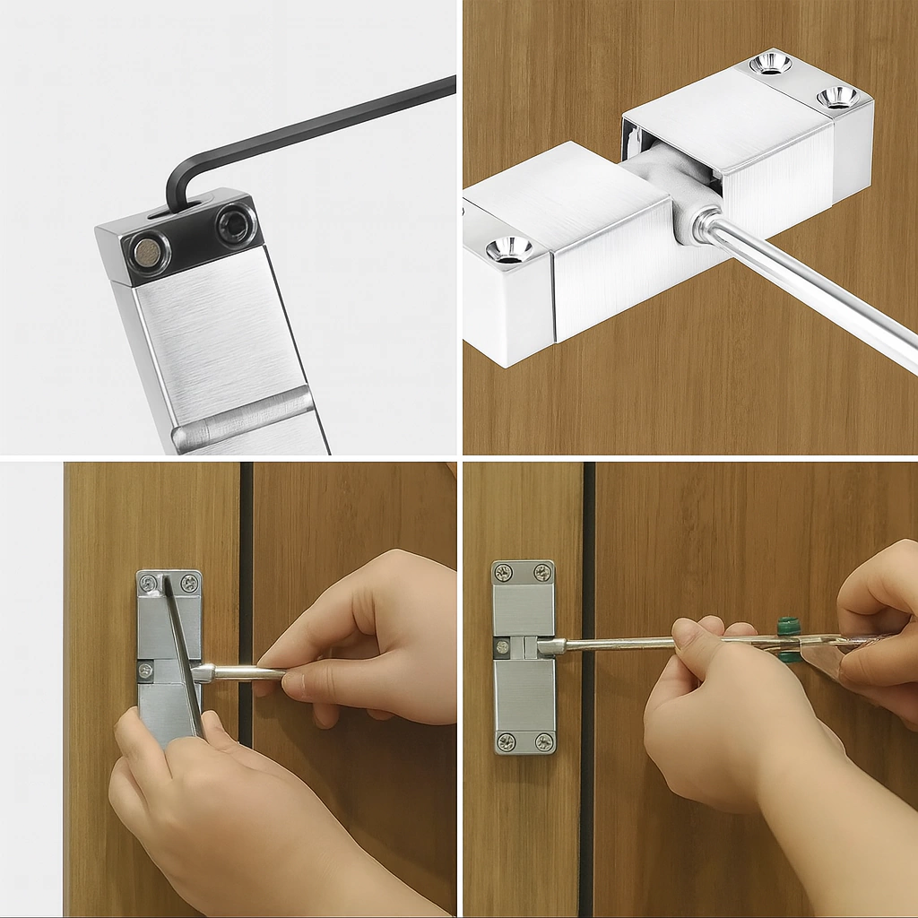 A velocidade de fechamento pode ser ajustada facilmente por meio da tensão da mola, oferecendo controle total sobre o movimento da porta. Compacto, eficiente e disponível em três cores elegantes: preto, prata e dourado 🖤⚙️💛