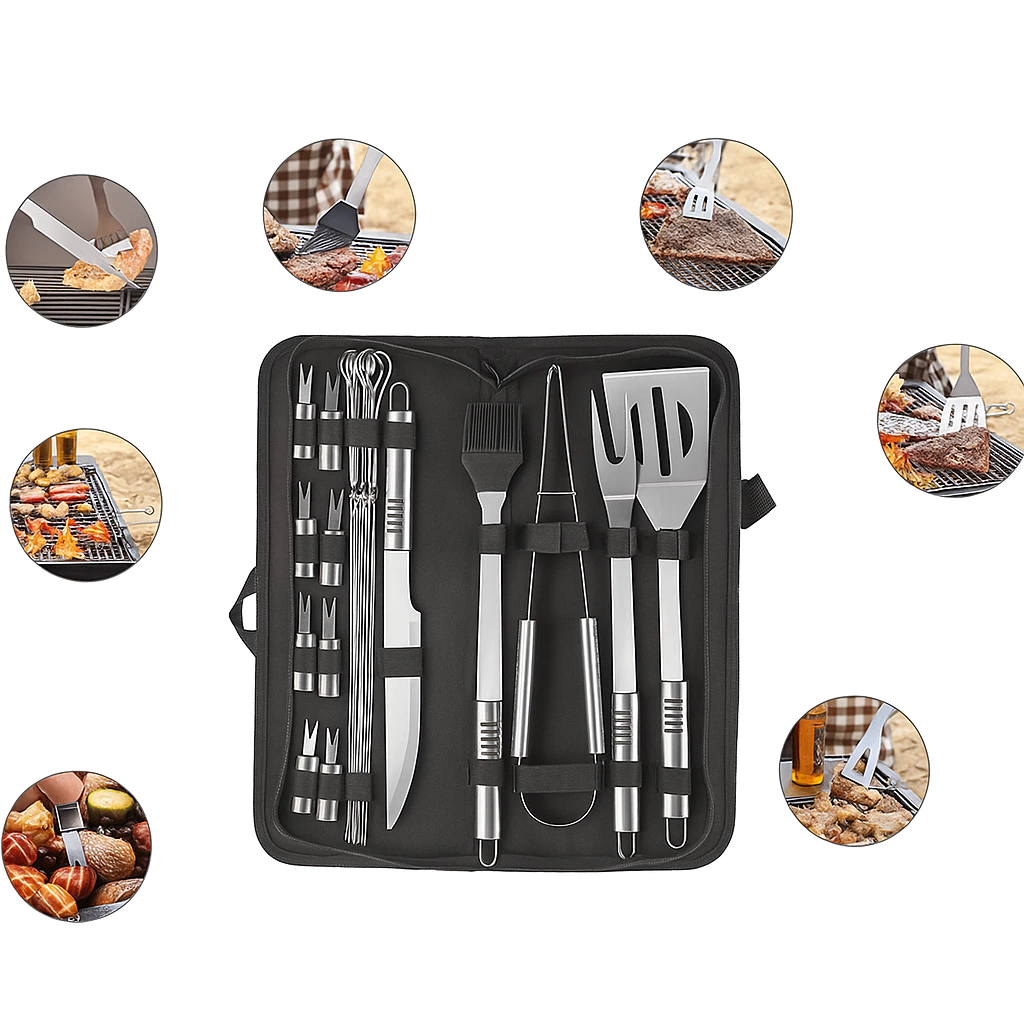 Perfeito para os amantes da grelha, este kit reúne tudo o que você precisa para preparar carnes, legumes e muito mais com praticidade e estilo. Inclui desde espátula, pinça e pincel para molhos, até pegadores de petiscos, tudo organizado em uma elegante bolsa de transporte.