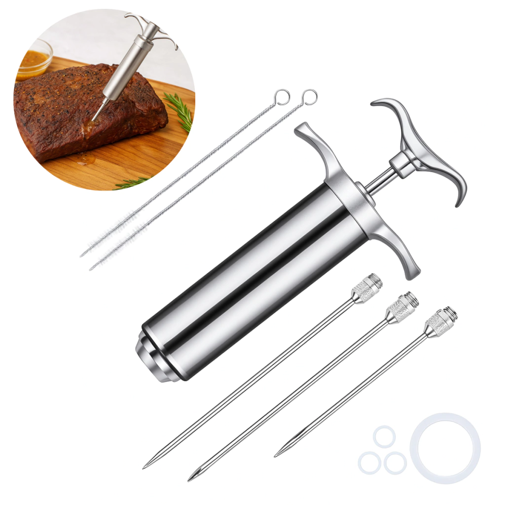 Fabricado em aço inoxidável 304, este kit é resistente, durável, certificado para uso alimentar (FDA, LFGB, ROHS e REACH) e ideal para injetar temperos diretamente nas carnes, garantindo mais sabor por dentro e por fora.