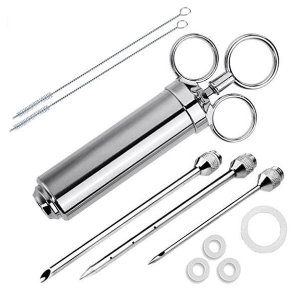 Com barril de 60ml, o injetor permite aplicar a marinada com praticidade, além de acompanhar 3 agulhas especiais para diferentes tipos de tempero — desde líquidos até ervas e sólidos como alho ou cebola. Perfeito para preparar frango, peru, carne bovina, suína, cordeiro, pato, ganso e muito mais!