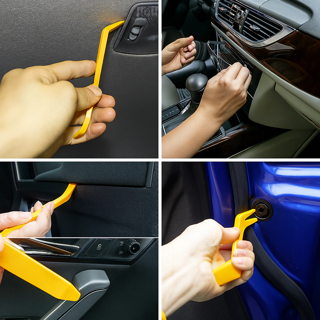 O conjunto oferece ferramentas para remoção de presilhas, grampos, acabamentos e até faróis, permitindo que você trabalhe com mais confiança, rapidez e qualidade. A maleta organizadora em lona mantém tudo no lugar, pronta para o transporte e uso diário.