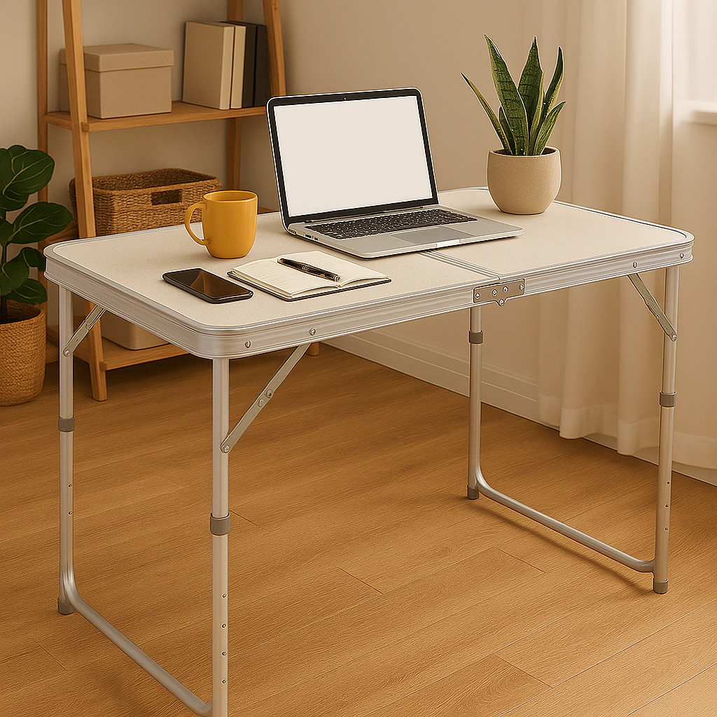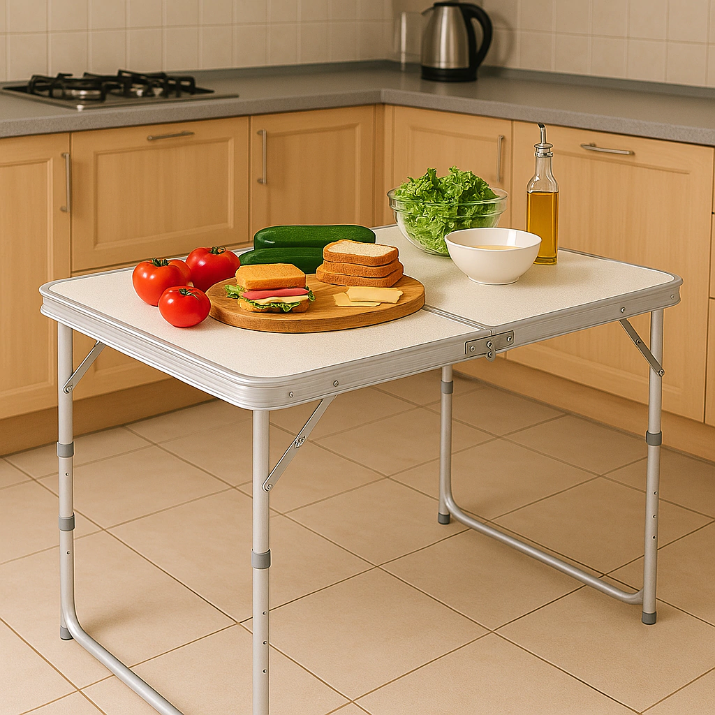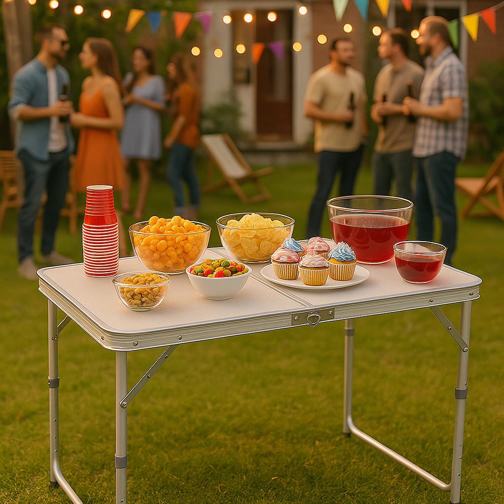 Ideal para camping, piqueniques ou casa de campo, esta mesa dobrável é a escolha perfeita para quem busca praticidade, resistência e facilidade de transporte. Com estrutura em alumínio e tampo em MDF aluminizado, ela suporta até 40 kg e é resistente à umidade e à oxidação.