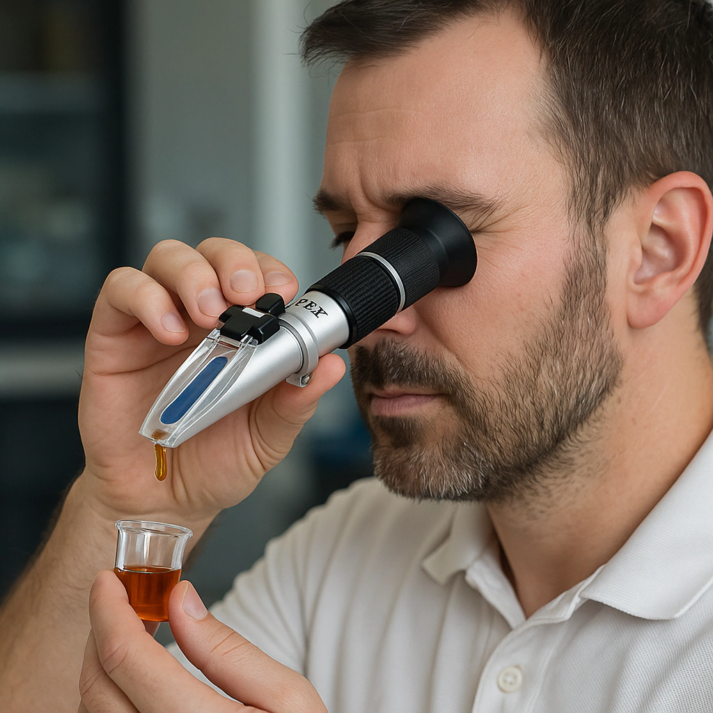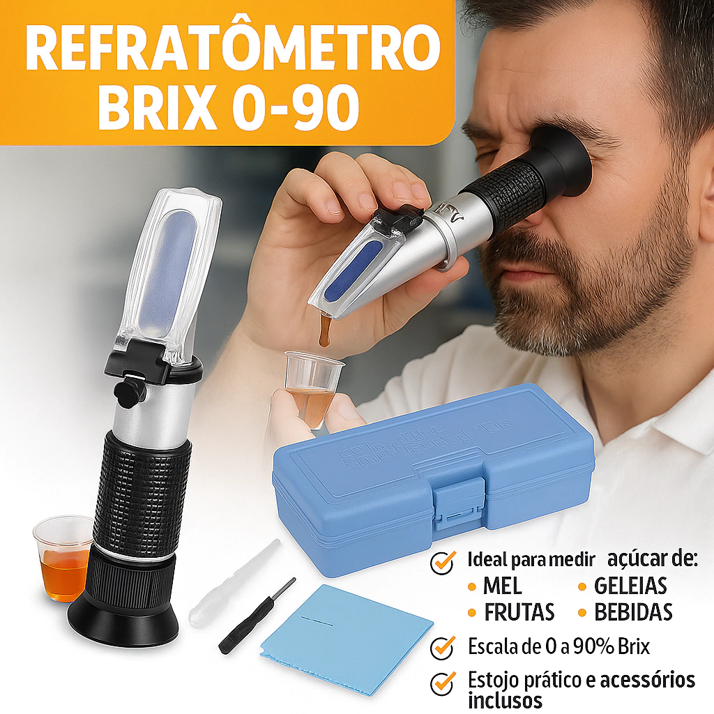 Tenha precisão e praticidade na medição de concentração de açúcares com o Refratômetro Brix 0–90% com ATC (Compensação Automática de Temperatura). Essencial para quem atua na produção de sucos, refrigerantes, bebidas lácteas, vinhos, cervejas artesanais e muito mais, este equipamento entrega resultados rápidos e confiáveis diretamente no campo ou no laboratório 🍇🧃🍻